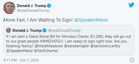 Με ανάρτησή του στο twitter ο αμερικανός Πρόεδρος καλεί την πρόεδρο της Βουλής των Αντιπροσώπων Νάνσυ Πελόζι να εγκρίνει νομοσχέδιο μέσω του οποίου οι Αμερικανοί πολίτες θα λάβουν επιταγές 1.200 δολαρίων.
