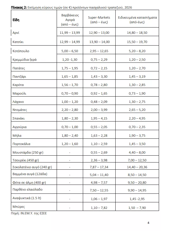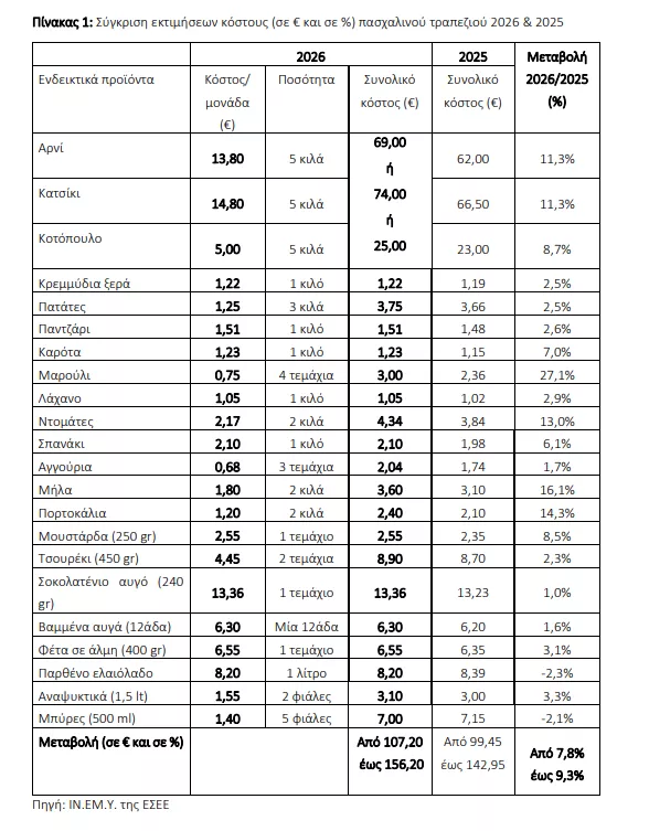 Το Ινστιτούτο Εμπορίου και Υπηρεσιών της Ελληνικής Συνομοσπονδίας Εμπορίου και Επιχειρηματικότητας (ΙΝ.ΕΜ.Υ. της ΕΣΕΕ), εκτίμησε και το 2026 το κόστος του πασχαλινού τραπεζιού. Καταγράφηκαν, με επιτόπια τιμοληψία και συνεντεύξεις οι τιμές τόσο από αλυσίδες Supermarkets όσο και από ειδικευμένα καταστήματα τροφίμων λιανικής (πχ ζαχαροπλαστεία, οπωροπωλεία, κρεοπωλεία κλπ), καθώς και από τη Βαρβάκειο αγορά.