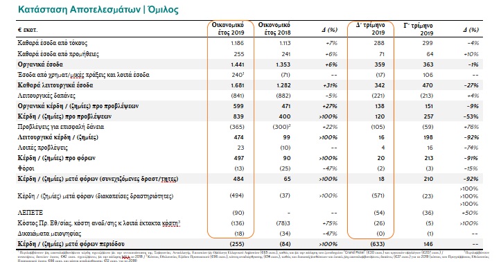 Σύμφωνα με τα αποτελέσματα που ανακοινώθηκαν σήμερα, τα λειτουργικά κέρδη ανήλθαν σε €465 εκατ. το 2019 από €75 εκατ. το 2018, αντικατοπτρίζοντας τη σημαντική αύξηση των οργανικών εσόδων κατά 6,8% σε ετήσια βάση, τα υψηλά κέρδη από χρηματοοικονομικές πράξεις, επωφελούμενα από μη επαναλαμβανόμενα κέρδη, την περιστολή του λειτουργικού κόστους, παρά την αρνητική επίπτωση από τη μετάβαση στο ΔΠΧΑ 16, καθώς και τη διατήρηση του κόστους πιστωτικού κινδύνου σε σχετικά χαμηλά επίπεδα εν μέσω της σημαντικής αποκλιμάκωσης ΜΕΑ κατά τη διάρκεια της χρονιάς.