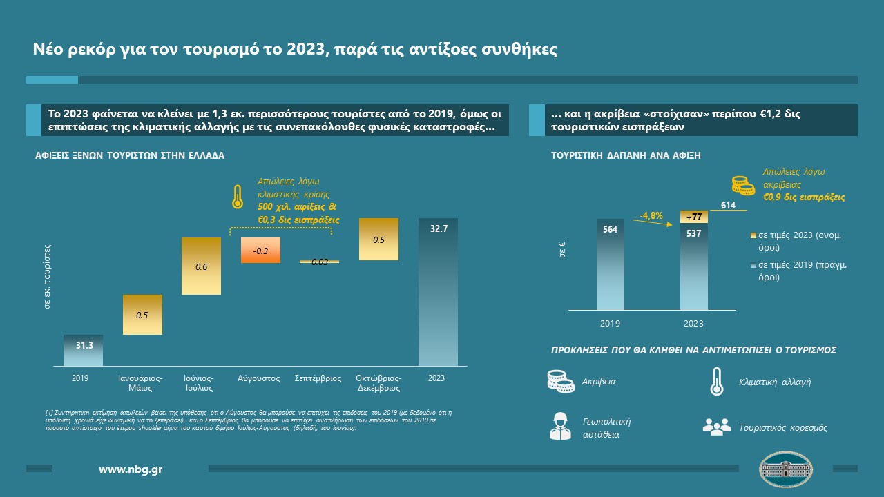Υπό αυτό το πρίσμα, ο ελληνικός τουρισμός αναμένεται να καταγράψει φέτος νέο ρεκόρ αφίξεων (+4% έναντι 2019), με τις εισπράξεις να ξεπερνούν το επίπεδο των €20 δις – επίπεδο συμβατό με την προηγούμενη εκτίμησή μας (τεύχος τρίτου τριμήνου) – καταλήγοντας έτσι 13% υψηλότερα σε σχέση με το 2019. Αξιοσημείωτο είναι ότι η εξαιρετική αυτή επίδοση επιτυγχάνεται σε μια χρονιά με αντίξοες συνθήκες, οι οποίες στοίχισαν στον ελληνικό τουρισμό εισπράξεις της τάξης του €1,2 δις, αφού: