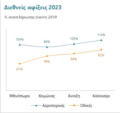 Όσον αφορά το τελευταίο τρίμηνο 2023, αναμένουμε συνέχιση της ανόδου με ρυθμό της τάξης του 11% έναντι 2019 (επιταχύνοντας από το +3% του πρώτου 9μηνου της χρονιάς), με στήριγμα την ισχυρή αεροπορική κίνηση του Οκτωβρίου (+21% έναντι 2019) και την υψηλή επίδοση πτήσεων στο πρώτο 20ήμερο Νοεμβρίου (+11% έναντι 2019).