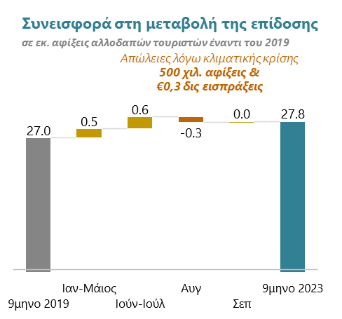 Οι φυσικές καταστροφές (πυρκαγιές) και οι ακραίες καιρικές συνθήκες – λόγω κλιματικής αλλαγής – θα μπορούσαν να θεωρηθούν ως η καίρια παράμετρος για την αδύναμη επίδοση του Αυγούστου, η οποία στοίχισε 0,3 εκ. αφίξεις (βάσει της συντηρητικής εκτίμησης ότι ο Αύγουστος μπορούσε να προσεγγίσει το επίπεδο του 2019). Ανάλογη εικόνα σκιαγραφούν τα αποτελέσματα για τον Σεπτέμβριο, με τις πλημμύρες να επιτρέπουν οριακή μόνο άνοδο αφίξεων (+0,6% έναντι 2019) – επίδοση σημαντικά χαμηλότερη αυτής του Ιουνίου (έτερου shoulder μήνα), στοιχίζοντας έτσι επιπλέον 0,2 εκ. αφίξεις.