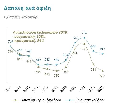 - Η ακρίβεια περιόρισε τον προϋπολογισμό των τουριστών, οδηγώντας σε συρρίκνωση την πραγματική δαπάνη ανά άφιξη (-5% έναντι 2019) – και έτσι η σχετικά περιορισμένη πραγματική κατανάλωση των τουριστών στοίχισε επιπλέον €0,9 δις εισπράξεων (υπό τη συντηρητική υπόθεση ότι η φετινή πραγματική δαπάνη ανά τουρίστα θα μπορούσε να είναι στα επίπεδα 2019).