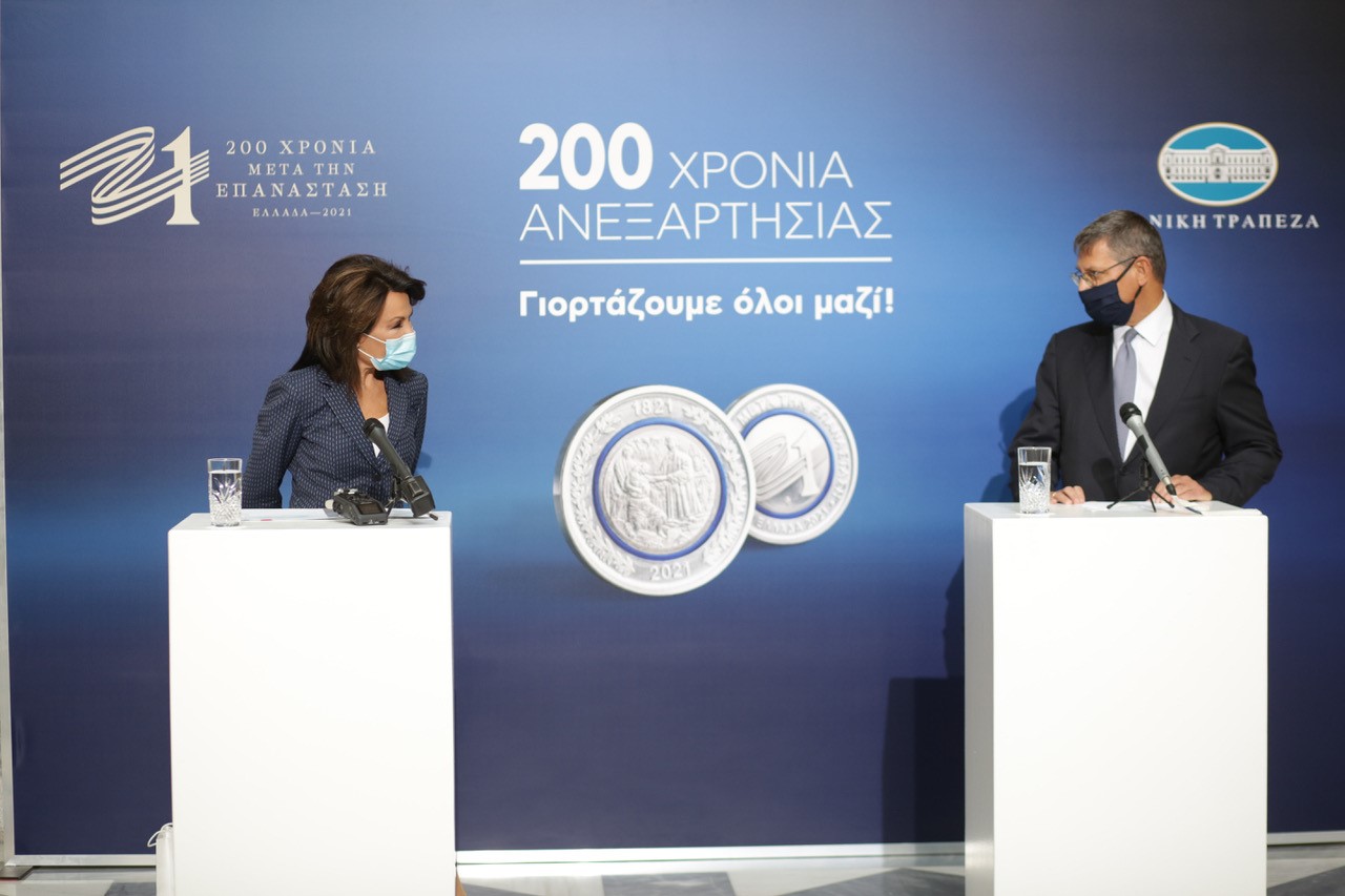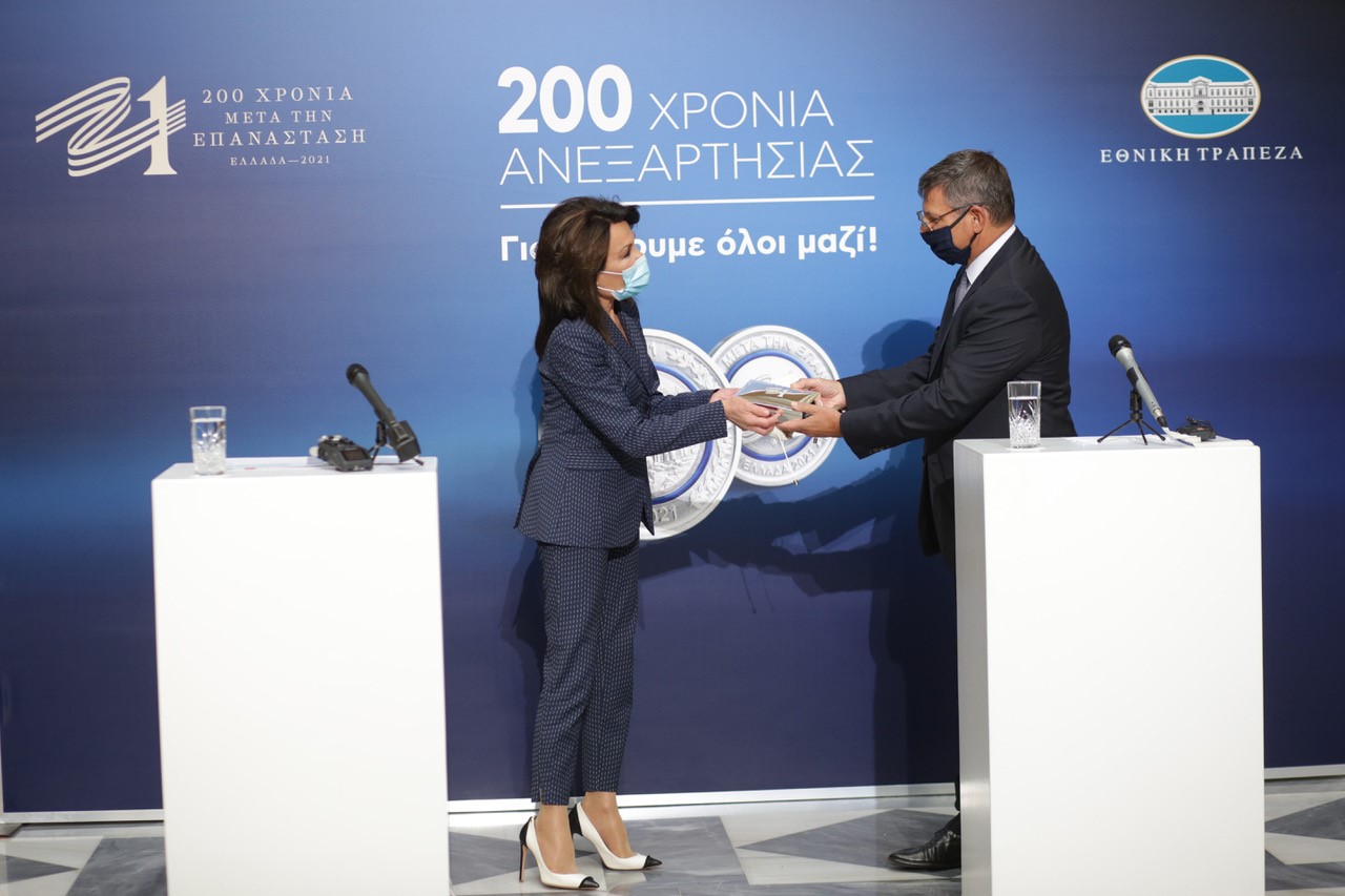Σήμερα, με την παραλαβή του επίσημου αναμνηστικού συλλεκτικού μεταλλίου της Επιτροπής "Ελλάδα 2021", αναλαμβάνουμε την αποκλειστική του διάθεση μέσω του δικτύου καταστημάτων μας αλλά και μέσω της ιστοσελίδας της Εθνικής και δεσμευόμαστε να μάθει το ευρύ κοινό την ύπαρξη και την αξία αυτής της προσπάθειας και να τη στηρίξει - να συμμετάσχει με το να το αποκτήσει. Ο εορτασμός της ανεξαρτησίας μας θα αποτελέσει Προπομπό για ένα ακόμη καλύτερο μέλλον. Για μια Ελλάδα που όλοι οραματιζόμαστε και θέλουμε να έχουμε».