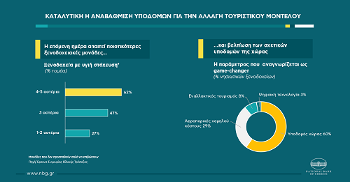 - Από την πλευρά των επιχειρήσεων, χρειάζεται στρατηγική στόχευση για την αύξηση πολυτελών ξενοδοχείων, δεδομένου ότι οι μονάδες 4-5 αστέρων καλύπτουν 23% των ελληνικών ξενοδοχείων, έναντι 65% στη Μεσόγειο. Αξιοσημείωτο είναι ότι η τάση αναβάθμισης είναι ήδη εμφανής, καθώς οι συγκεκριμένες κατηγορίες σημείωσαν αύξηση 57% την τελευταία δεκαετία στην Ελλάδα (με διπλασιασμό των ξενοδοχείων 5 αστέρων), έναντι μείωσης 15% σε μονάδες 1-2 αστέρων. Τα πολυτελή ξενοδοχεία μπορούν να προσελκύσουν τουρίστες υψηλής δαπάνης ενώ παράλληλα παρουσιάζουν καλύτερες επιδόσεις από χαμηλότερης ποιότητας ξενοδοχεία. Συγκεκριμένα, φάνηκαν πιο ανθεκτικά στην τρέχουσα κρίση (με 62% του τομέα να έχει υγιή στόχευση, έναντι 27% για ξενοδοχεία 1-2 αστέρων), ενώ αναμένουν μικρότερη πτώση πωλήσεων το 2020 (35%, έναντι 50% για τα 1-2 αστέρων).