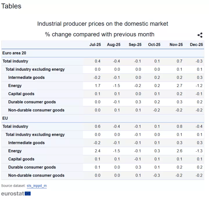 Euro area industrial #ProducerPrices down by 0.3% in December 2025 over November 2025, -2.1% compared with December 2024 https://t.co/y95ZK0suO3 pic.twitter.com/WTzrdHJfKx
