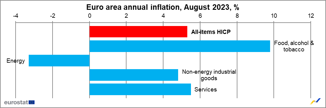 Ο ετήσιος πληθωρισμός της ζώνης του ευρώ αναμένεται να διαμορφωθεί στο 5,3% τον Αύγουστο του 2023, σταθερός σε σχέση με τον Ιούλιο, σύμφωνα με έκτακτη εκτίμηση της Eurostat, της στατιστικής υπηρεσίας της Ευρωπαϊκής Ένωσης.