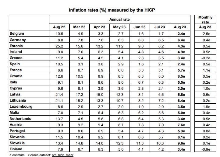 Για την Ελλάδα, τα στοιχεία της Eurostat έδειξαν μικρή επιβράδυνση του ετήσιου πληθωρισμού στο 3,4% τον Αύγουστο από 3,5% τον Ιούλιο.