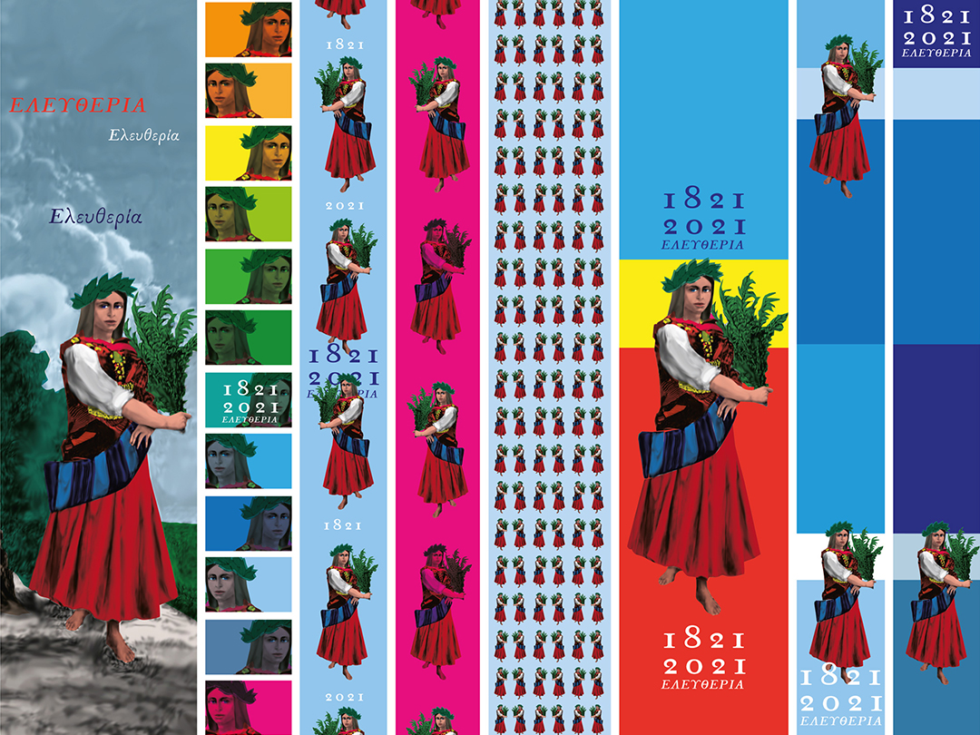 Σε αυτόν τον καμβά μοναδική πρωταγωνίστρια είναι η φιγούρα της Ελευθερίας, όπως ενσαρκώνεται στη μορφή ενός νεαρού κοριτσιού. Φορώντας στο κεφάλι το δάφνινο στεφάνι, κρατώντας δοξαστικά φύλλα δάφνης, ενδεδυμένη με παραδοσιακή γιορτινή φορεσιά και με γυμνά πέλματα που πατούν απευθείας το ελληνικό χώμα, έχει το βλέμμα στραμμένο στο μέλλον, με μια αισιοδοξία χαρακτηριστική της φύσης του Έλληνα. Η λέξη «Ελευθερία» καθώς και οι χρονολογίες 1821 -2021 σε διάφορα σημεία του καμβά λειτουργούν ως κορωνίδα υπογραμμίζοντας τον επετειακό χαρακτήρα του σχεδίου.