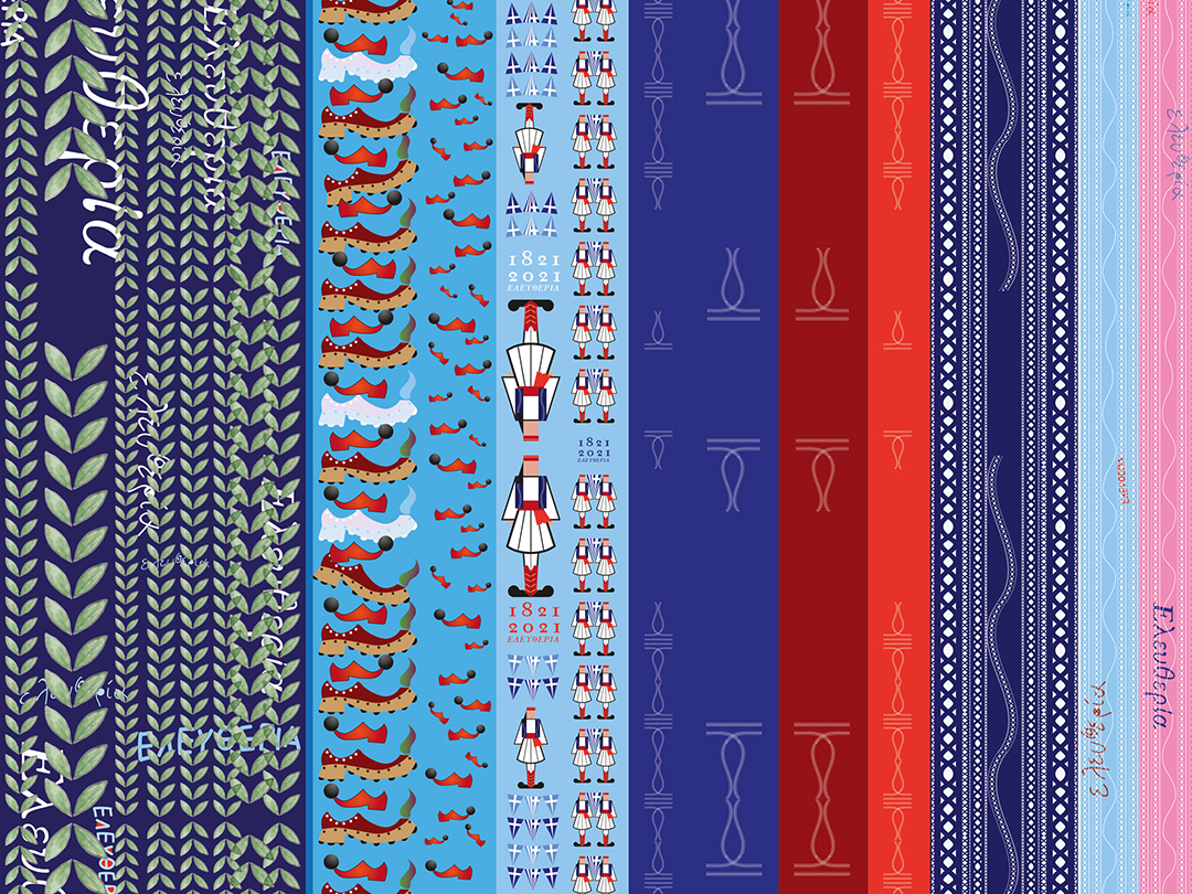 Σύμβολα της δόξας και η λέξη «ΕΛΕΥΘΕΡΙΑ» αποτελούν πηγή έμπνευσης και δίνουν όνομα στο πρώτο από τα δύο σχέδια. Η αίσθηση της γιορτής ενισχύεται από τις τιμητικές δάφνες να μπλέκονται με τα γράμματα της λέξης ελευθερία, από τα εορταστικά σημαιάκια αλλά και από την επίσημη εορταστική φορεσιά των τσολιάδων που δεσπόζουν στο κέντρο αυτού του πολύχρωμου έργου.