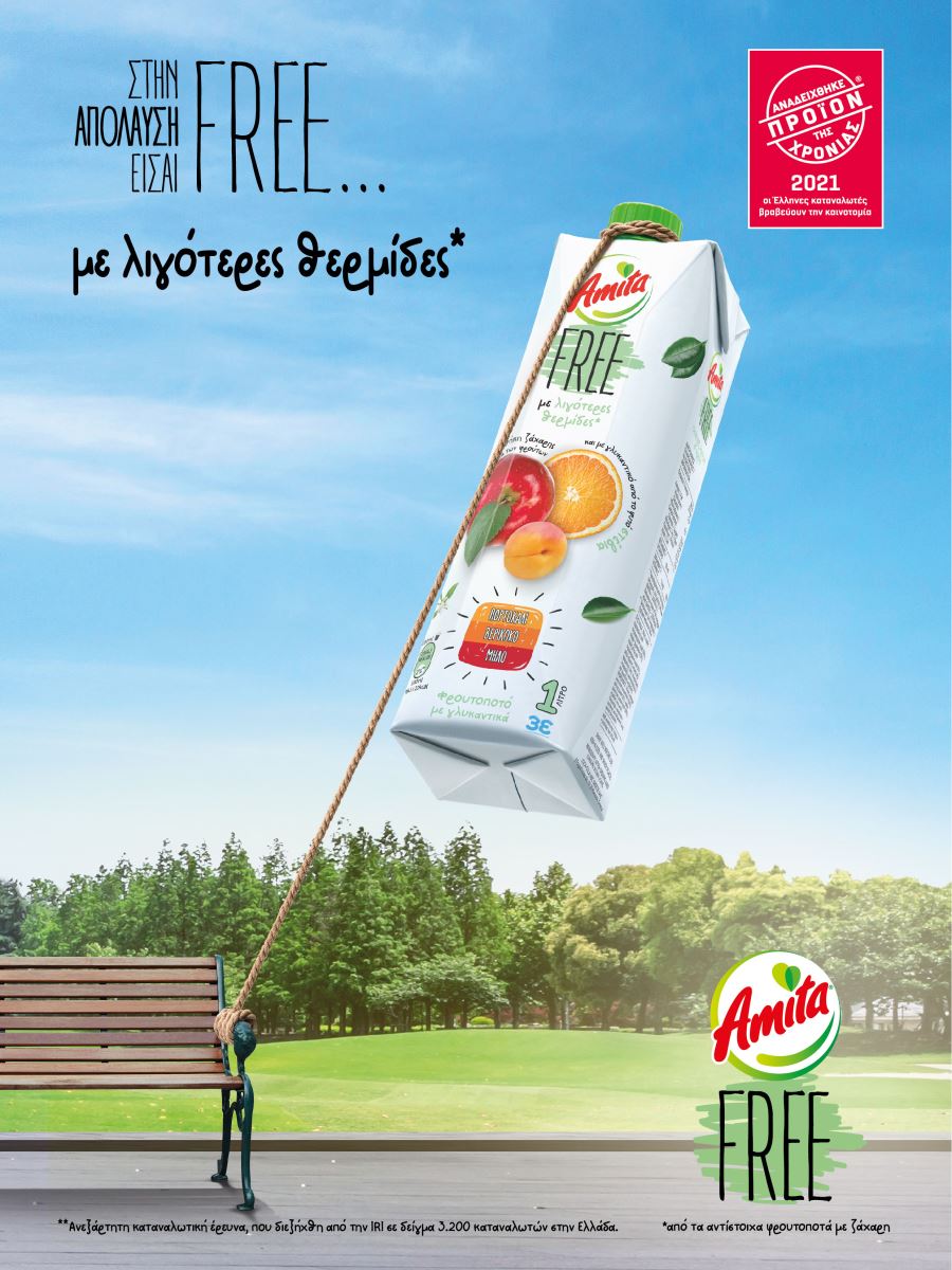 H Amita Free, ο νέος χυμός με λιγότερες θερμίδες*, χωρίς προσθήκη ζάχαρης και με γλυκαντικό από το φυτό στέβια, απέσπασε συνολικά 3 σημαντικές διακρίσεις, τόσο για τη γεύση όσο και για την καινοτόμο σύστασή της.