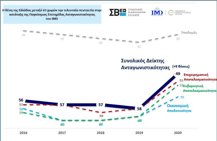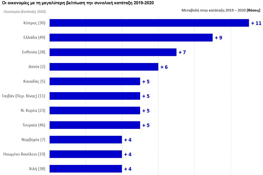 Βάσει των νέων δεδομένων, η Ελλάδα βρίσκεται στην 49η θέση μεταξύ 63 οικονομιών, από την 58η την οποία κατείχε την περσινή χρονιά, δηλαδή το 2019.