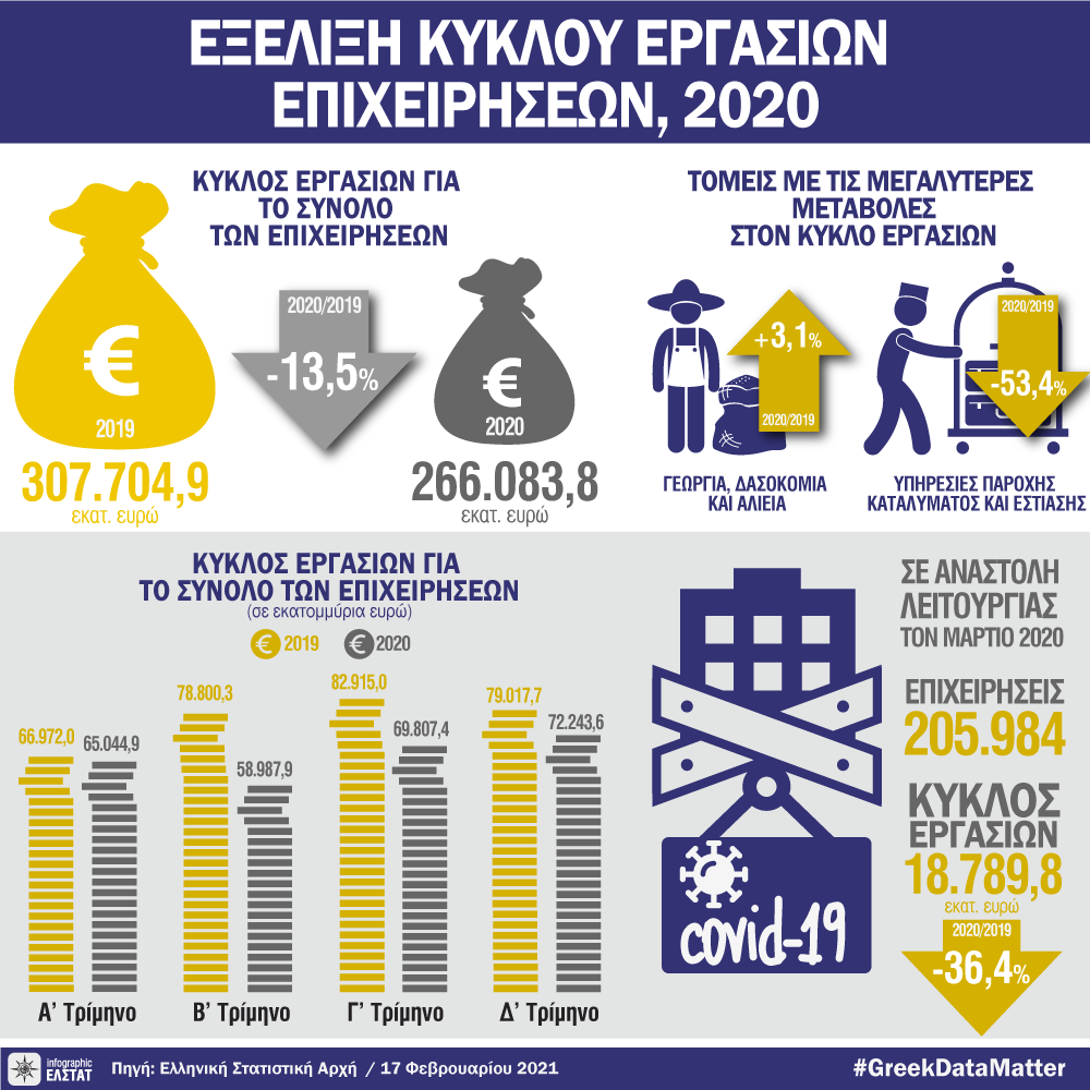Όπως ανακοίνωσε η ΕΛΣΤΑΤ, για το σύνολο των επιχειρήσεων και των δραστηριοτήτων της οικονομίας, ο κύκλος εργασιών το 2020 ανήλθε σε 266 δισ. ευρώ σημειώνοντας μείωση 13,5% σε σχέση με το 2019, που είχε ανέλθει σε 307,7 δισ ευρώ.
