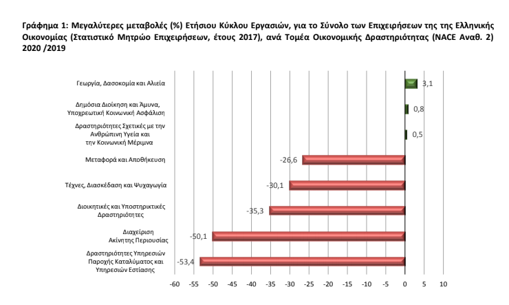 Τη μεγαλύτερη μείωση κατά 53,4% παρουσίασαν οι επιχειρήσεις του τομέα «Δραστηριότητες υπηρεσιών παροχής καταλύματος και υπηρεσιών εστίασης», ενώ τη μικρότερη μείωση κατά 2,4% παρουσίασαν οι επιχειρήσεις του τομέα «Παροχή νερού, επεξεργασία λυμάτων, διαχείριση αποβλήτων και δραστηριότητες εξυγίανσης». Από την άλλη πλευρά, τη μεγαλύτερη αύξηση κατά 3,1% παρουσίασαν οι επιχειρήσεις του τομέα «Γεωργία, δασοκομία και αλιεία».