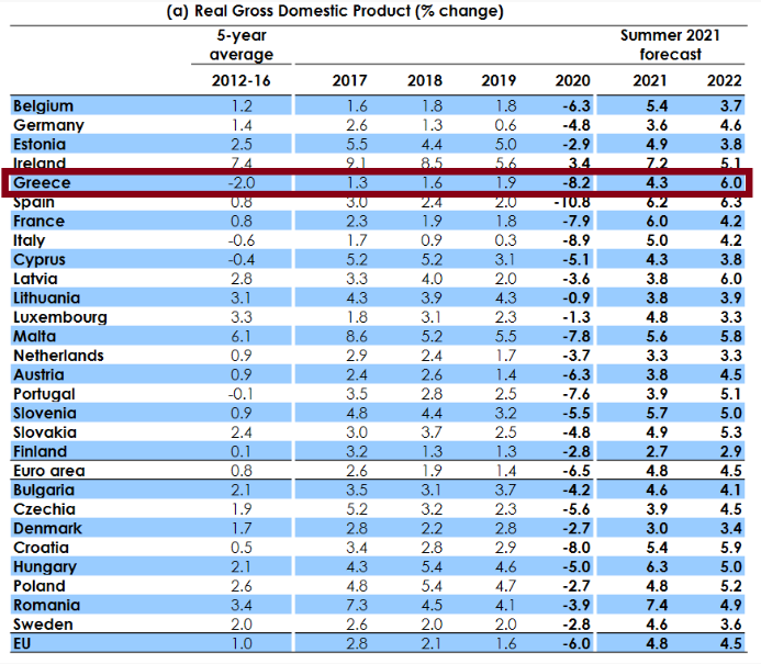Άλμα με τη δεύτερη υψηλότερη ανάπτυξη στην Ευρωπαϊκή Ένωση το 2022 αναμένεται να κάνει η ελληνική οικονομία. Το 6% που αναφέρουν οι θερινές προβλέψεις της Κομισιόν για την Ελλάδα, εφόσον επιβεβαιωθεί, θα είναι το δεύτερο υψηλότερο ποσοστό ανάπτυξης μεταξύ των 27 και ελαφρώς κάτω από την Ισπανία, όπου οι εκτιμήσεις μιλούν για 6,3%.