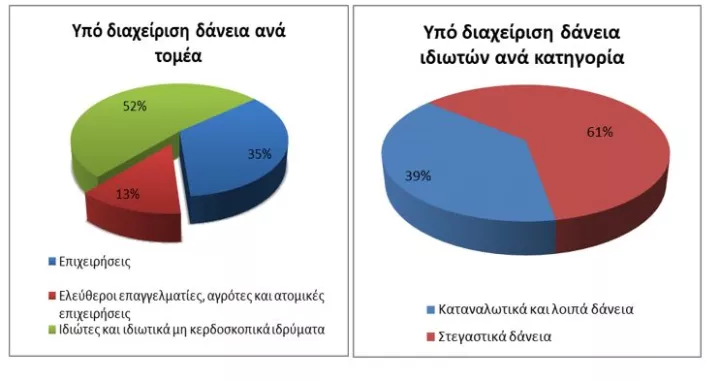 Η αξία των υπό διαχείριση δανείων προς ιδιώτες και ιδιωτικά μη κερδοσκοπικά ιδρύματα μειώθηκε κατά 610 εκατ. ευρώ και έφτασε τα 41,36 δισ. ευρώ ενώ τα υπό διαχείριση στεγαστικά δάνεια μειώθηκαν κατά 116 εκατ. και έφτασαν τα 24,25 δισ. ευρώ.