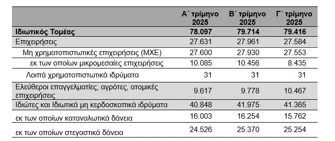 Η ονομαστική αξία των υπό διαχείριση δανείων προς ελεύθερους επαγγελματίες, αγρότες και ατομικές επιχειρήσεις αυξήθηκε κατά 689 εκατ. ευρώ έναντι του προηγούμενου τριμήνου και διαμορφώθηκε σε 10.467 εκατ. ευρώ στο τέλος του γ΄ τριμήνου του 2025.