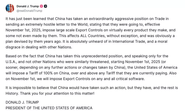 «Μόλις έγινε γνωστό ότι η Κίνα έχει υιοθετήσει μια εξαιρετικά επιθετική στάση στον τομέα του εμπορίου, αποστέλλοντας μια εξαιρετικά εχθρική επιστολή στον κόσμο, στην οποία δηλώνει ότι από την 1η Νοεμβρίου 2025 θα επιβάλει ελέγχους εξαγωγών μεγάλης κλίμακας σε σχεδόν όλα τα προϊόντα που κατασκευάζει, καθώς και σε ορισμένα που δεν κατασκευάζει η ίδια.