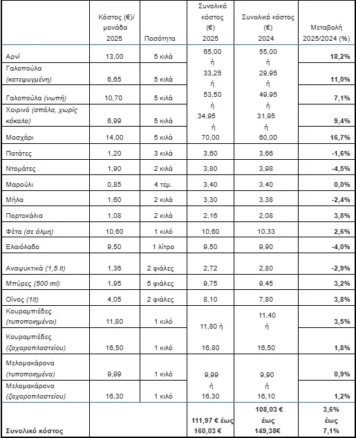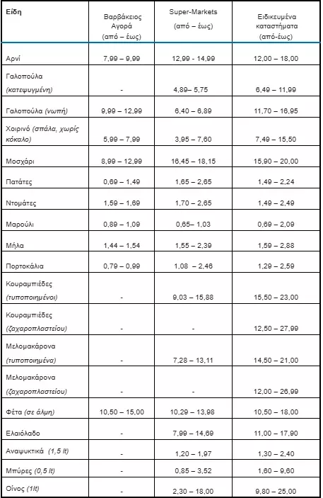 Η εικόνα προκύπτει από επιτόπια έρευνα τιμών σε όλη τη χώρα, με στοιχεία τόσο από μεγάλες αλυσίδες σούπερ μάρκετ όσο και από παραδοσιακά κρεοπωλεία, ζαχαροπλαστεία και αγορές, όπως η Βαρβάκειος. Το μεγάλο εύρος τιμών αντανακλά τις διαφορές ποιότητας, προέλευσης και τύπου καταστήματος, αλλά και τις αποκλίσεις που εξακολουθούν να υπάρχουν μεταξύ τοπικών αγορών.