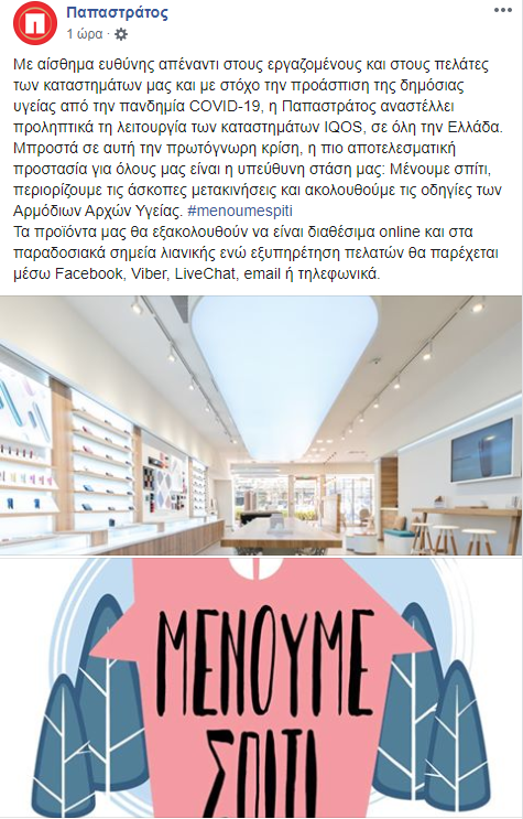 «Με αίσθημα ευθύνης απέναντι στους εργαζομένους και στους πελάτες των καταστημάτων μας και με στόχο την προάσπιση της δημόσιας υγείας από την πανδημία COVID-19, η Παπαστράτος αναστέλλει προληπτικά τη λειτουργία των καταστημάτων IQOS, σε όλη την Ελλάδα. Μπροστά σε αυτή την πρωτόγνωρη κρίση, η πιο αποτελεσματική προστασία για όλους μας είναι η υπεύθυνη στάση μας: Μένουμε σπίτι, περιορίζουμε τις άσκοπες μετακινήσεις και ακολουθούμε τις οδηγίες των Αρμόδιων Αρχών Υγείας. #menoumespiti
