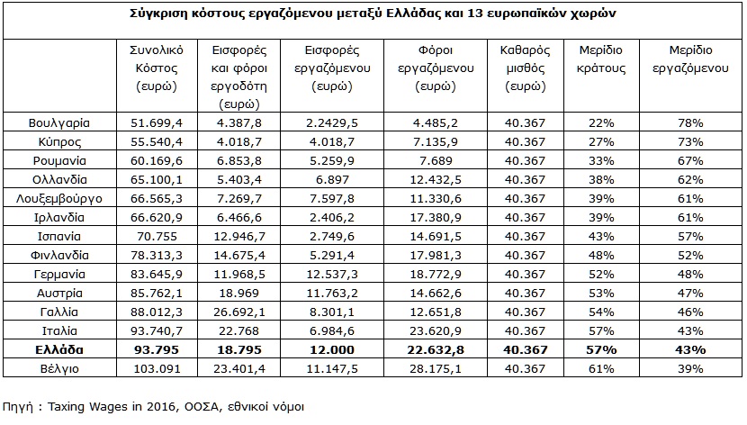 Στην περίπτωση της Ελλάδας, η απάντηση είναι 93.795 ευρώ. 'Η για να το πούμε διαφορετικά, ένας υψηλά αμειβόμενος εργαζόμενος στην Ελλάδα των 40.000 ευρώ, έχει συνολικό κόστος πάνω από 90.000 ευρώ. Η διαφορά των 50.000 ευρώ αναλύεται σε: 12.000 ευρώ οι ασφαλιστικές του εισφορές, 22.632,8 ευρώ ο φόρος του, ενώ τα υπόλοιπα 18.795 ευρώ αφορούν τις εισφορές που πρέπει να καταβάλει ο εργοδότης, ο οποίος και τον απασχολεί.