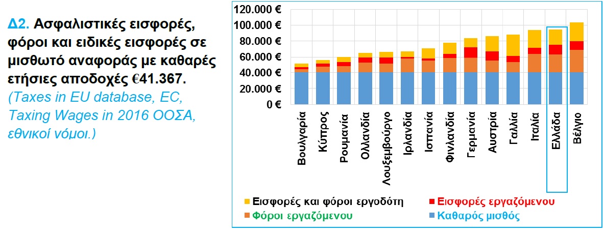 Αδιάψευστος μάρτυρας μια απλή σύγκριση ανάμεσα στα στοιχεία της μισθολογικής εκκαθάριση μεγάλων εταιρειών για τον Ιανουάριο του 2017, έπειτα δηλαδή και τις πρόσφατες αλλαγές στο ασφαλιστικό, και της βάσης δεδομένων του ΟΟΣΑ για τις απολαβές σε άλλες χώρες της Ευρωπαϊκής Ένωσης (Taxing Wages 2016).