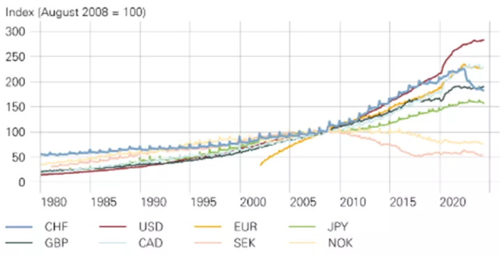 Ο Jörn Tenhofen σε μια πρόσφατη μελέτη της Ελβετικής Κεντρικής Τράπεζας κατέδειξε ότι αν και το ποσοστό συναλλαγών που πραγματοποιούνται με μετρητά έχει μειωθεί, η συνολική αξία των χαρτονομισμάτων σε κυκλοφορία αυξάνεται σταθερά στις περισσότερες χώρες. Μεταξύ της χρηματοπιστωτικής κρίσης του 2008 και του 2021, η αξία των τραπεζογραμματίων σε κυκλοφορία στις ΗΠΑ αυξήθηκε κατά 168%. Πρόκειται για ετήσιο ρυθμό αύξησης 8,6%, σε σύγκριση με μέσο ετήσιο πληθωρισμό 2,2% κατά την ίδια περίοδο. Στην Ελβετία, η αξία των τραπεζογραμματίων σε κυκλοφορία αυξήθηκε κατά 125%, ή 7% ετησίως, έναντι μέσου πληθωρισμού… 0,0%.