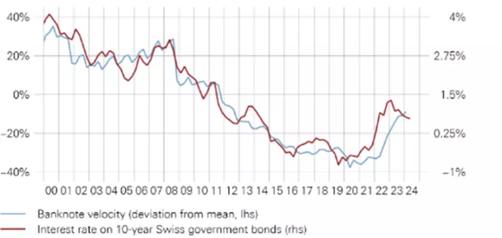 Όταν τα επιτόκια είναι χαμηλά, το κόστος ευκαιρίας της διακράτησης μετρητών μειώνεται και μπορεί ακόμη και να μετατραπεί σε όφελος ευκαιρίας αν τα επιτόκια είναι αρνητικά. Αντίστοιχα, θα περίμενε κανείς να μειωθεί η κυκλοφοριακή ταχύτητα των μεγάλων χαρτονομισμάτων σε ένα περιβάλλον χαμηλών επιτοκίων, καθώς τα νοικοκυριά και οι επιχειρήσεις τα κρατούν για μεγαλύτερο χρονικό διάστημα. Και πράγματι, αυτό παρατηρείται στην Ελβετία: η ταχύτητα κυκλοφορίας των μεγάλων χαρτονομισμάτων μειώθηκε όσο τα επιτόκια έπεφταν, αλλά αυξήθηκε ξανά τα τελευταία χρόνια όταν τα επιτόκια άρχισαν να ανεβαίνουν.