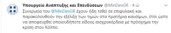 Συνεργεία του υπουργείου Ανάπτυξης και Επενδύσεων έχουν ήδη τεθεί σε επιφυλακή και παρακολουθούν την εξέλιξη των τιμών στα πρατήρια καυσίμων, έτσι ώστε να αποφευχθεί οποιουδήποτε είδους αισχροκέρδεια με πρόσχημα την κρίση στον Κόλπο.