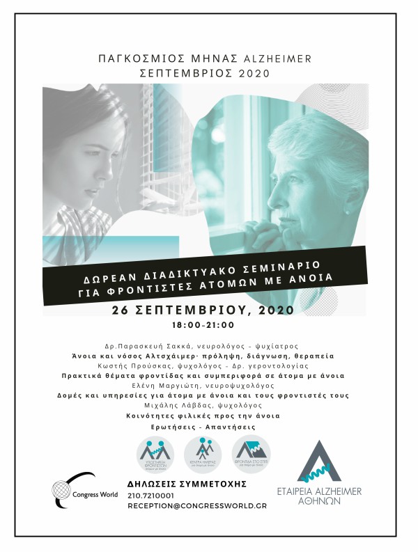 Η πανδημία αλλάζει τη μεθοδολογία των δράσεων της Εταιρείας Alzheimer Αθηνών, χωρίς όμως να την εμποδίζει να είναι πάντα σε επαφή με τα άτομα με άνοια και τους φροντιστές τους. Η Εταιρεία Alzheimer Αθηνών, το Σάββατο, 26 Σεπτεµβρίου 2020, 18.00-21.00, διοργανώνει δωρεάν διαδικτυακό εκπαιδευτικό σεμινάριο για φροντιστές ατόμων με άνοια.