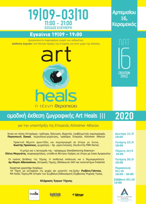 Στο πλαίσιο του Παγκόσμιου Μήνα Αλτσχάιμερ, διοργανώνεται για τρίτη συνεχή χρονιά ομαδική έκθεση ζωγραφικής, με τίτλο «Η Τέχνη Θεραπεύει – Art Heals ΙΙΙ».
