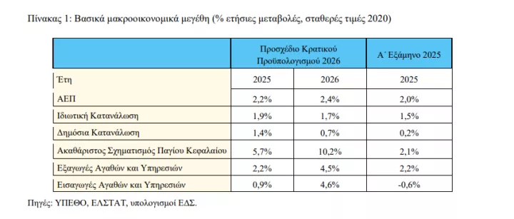 Με ρυθμό 2,4% αναμένεται να αναπτυχθεί η ελληνική οικονομία για το 2026, σύμφωνα με όσα αναφέρονται στο προσχέδιο του Προϋπολογισμού με βάση την εισήγηση από Ελληνικό Δημοσιονομικό Συμβούλιο (ΕΔΣ), που είναι η «βάση» για το Προσχέδιο του Κρατικού Προϋπολογισμού (ΠΚΠ) του 2026.