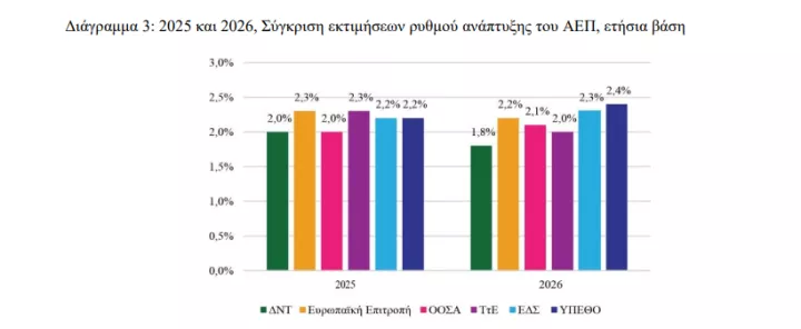 Σημειώνεται πως η εκτίμηση για ανάπτυξη 2,4% είναι του υπουργείου Εθνικής Οικονομίας και Οικονομικών, ενώ η εκτίμηση του ΕΔΣ «βλέπει» ανάπτυξη 2,3% για τον επόμενο χρόνο, «σε κλίμα έντονης αβεβαιότητας, που πυροδοτείται από τις διεθνείς εντάσεις και τις πολιτικές και οικονομικές αναταράξεις σε ευρωπαϊκές χώρες» όπως σημειώνεται στην έκθεση.