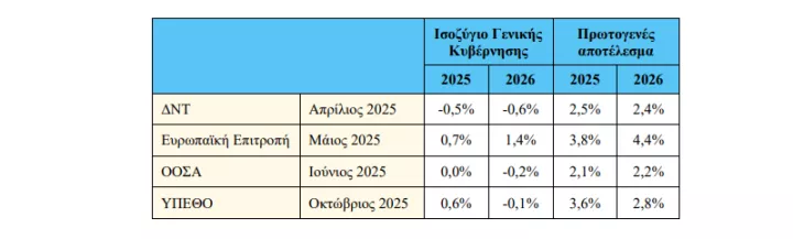 Το ΕΔΣ σημειώνει ακόμα πως το ισοζύγιο της Γενικής Κυβέρνησης αναμένεται να διαμορφωθεί πλεονασματικό το 2025 (0,6% του ΑΕΠ), και οριακά ελλειμματικό το 2026 (-0,1% του ΑΕΠ).