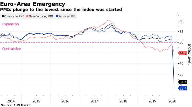Στις 31,4 μονάδες βυθίστηκε τον Μάρτιο ο σύνθετος δείκτης τιμών παραγωγού για την Ευρωζώνη, που είναι το χαμηλότερο επίπεδο που έχει καταγραφεί από τον Ιούλιο του 1998 όταν ξεκίνησε ο δείκτης. Τον Φεβρουάριο, ο PMI είχε διαμορφωθεί στις 51,6 μονάδες, ενώ υπενθυμίζεται ότι πάνω από 50 μονάδες τα στοιχεία δείχνουν ανάπτυξη ενώ κάτω από 50 δείχνουν συρρίκνωση δραστηριότητας.