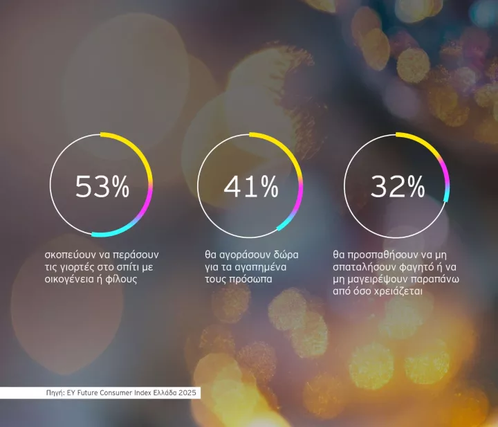 Σχολιάζοντας τις προθέσεις των καταναλωτών σχετικά με τις αγορές κατά την εορταστική περίοδο, ο Θάνος Μαύρος, Εταίρος της EY Ελλάδος και Επικεφαλής Τομέα Λιανεμπορίου της EY στη Νοτιοανατολική Ευρώπη, δήλωσε: «Σε ένα περιβάλλον επίμονου πληθωρισμού, οι καταναλωτές φαίνεται πως θα κινηθούν οριακά πιο ζωηρά στις εορταστικές τους αγορές, σε σχέση με πέρυσι. Η τιμή παραμένει βασικό κριτήριο, ενώ σχεδιάζουν να ξοδέψουν κυρίως σε είδη πρώτης ανάγκης, αποφεύγοντας υπερβολικές δαπάνες. Ωστόσο, όπως και για την περίοδο του Black Friday και Cyber Monday, η γενική εικόνα είναι βελτιωμένη σε σχέση με πέρσι, καθώς μειώνεται αισθητά το ποσοστό όσων σχεδιάζουν να περιορίσουν τις αγορές τους. Τα ευρήματα αυτά μας επιτρέπουν να είμαστε συγκρατημένα αισιόδοξοι για την κίνηση του λιανεμπορίου κατά τη φετινή εορταστική περίοδο».