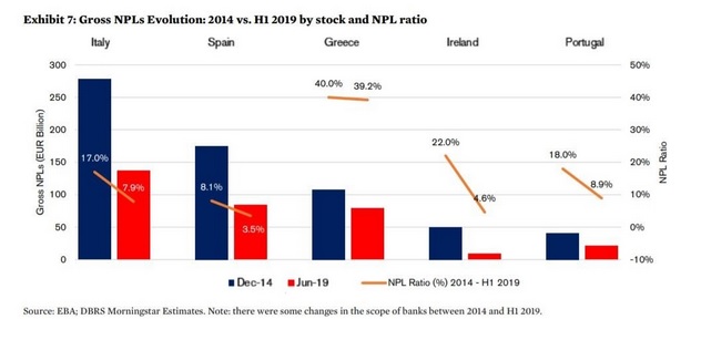 Από τον Δεκέμβριο του 2014 μέχρι το τέλος του 2019 όλες οι χώρες που εμφάνιζαν υψηλό απόθεμα «κόκκινων» δανείων κατάφεραν με τον ένα ή τον άλλο τρόπο να βρουν λύσεις στο πρόβλημα. Η μοναδική που παρέμεινε απολύτως στάσιμη ήταν η Ελλάδα. Η Ιρλανδία και η Ισπανία προχώρησαν σε ραγδαία μείωση των NPEs και ακολούθησαν με μικρότερη ταχύτητα, αλλά εξίσου εντυπωσιακά αποτελέσματα, Πορτογαλία και Ιταλία.
