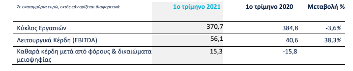 Σύμφωνα με σχετική ανακοίνωση, η σταδιακή εξομάλυνση των συνθηκών που δημιούργησε η πανδημία του κορονοϊού, η λειτουργική ευελιξία του Ομίλου και η αναβολή των εργασιών συντήρησης στις ΗΠΑ είχαν ως αποτέλεσμα την αύξηση των λειτουργικών κερδών (EBITDA) τα οποία διαμορφώθηκαν στα 56,1 εκατ. ευρώ έναντι 40,6 εκατ. ευρώ το 2020. Το πρώτο τρίμηνο του 2021 τα καθαρά κέρδη μετά από φόρους και δικαιώματα μειοψηφίας αυξήθηκαν σε 15,3 εκατ. ευρώ, βελτιωμένα κατά 31 εκατ. ευρώ, έναντι ζημίας 15,8 εκατ. ευρώ το πρώτο τρίμηνο του 2020, η οποία συμπεριελάμβανε 9 εκατ. ευρώ από την αποτίμηση συμβάσεων hedging επιτοκίου σε δολάρια.