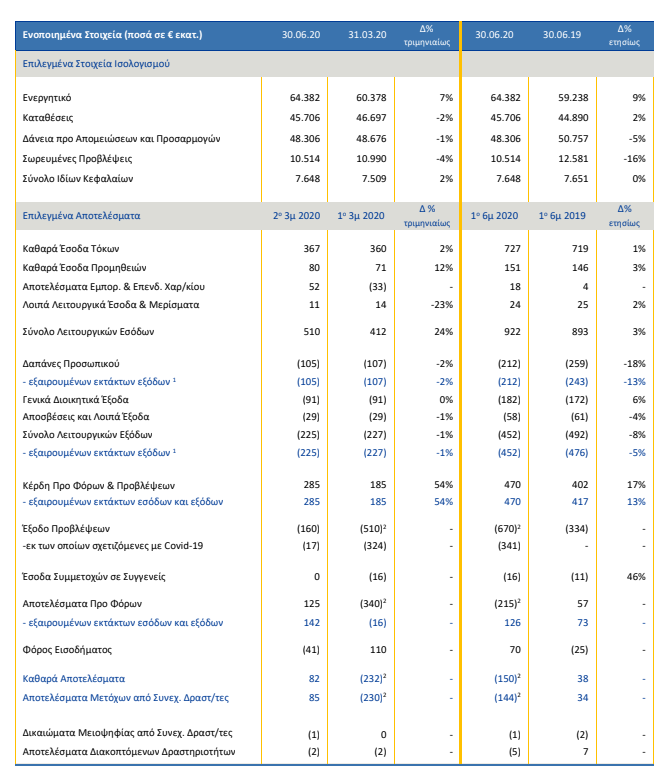 H Τράπεζα σημείωσε ικανοποιητικά οικονομικά αποτελέσματα κατά το 1ο εξάμηνο 2020. Τα καθαρά έσοδα τόκων και προμηθειών αυξήθηκαν σε ετήσια βάση κατά +1% και + 3% αντίστοιχα, ενώ το λειτουργικό κόστος μειώθηκε περαιτέρω κατά 10% ετησίως σε συγκρίσιμη βάση. Τα αποτελέσματα προ προβλέψεων και φόρων ανήλθαν στα €470 εκατ., κατά 17% υψηλότερα σε σύγκριση με την ίδια περίοδο πέρυσι. Οι προβλέψεις αυξήθηκαν στα €670 εκατ., με €341 εκατ. από αυτές να σχετίζονται με το Covid-19. Τα αποτελέσματα προ φόρων ήταν ζημιογόνα κατά €215 εκατ. έχοντας ενσωματώσει την επίπτωση της πανδημίας κατά το πρώτο εξάμηνο του 2020, ενώ εξαιρουμένων των επιπτώσεων ανήλθαν σε κέρδη προ φόρων €126 εκατ.