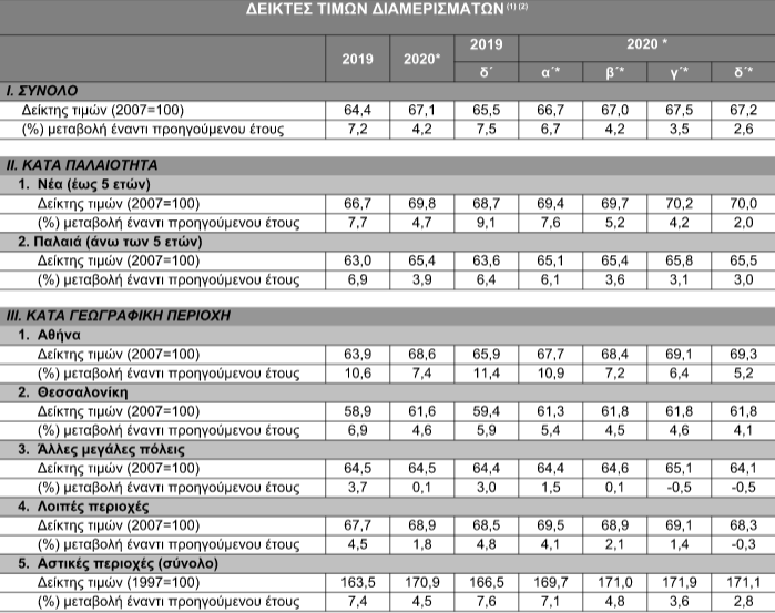 Τέλος, για το σύνολο των αστικών περιοχών της χώρας, το δ΄ τρίμηνο του 2020 οι τιμές των διαμερισμάτων αυξήθηκαν κατά 2,8% σε σύγκριση με το δ΄ τρίμηνο του 2019, ενώ για το 2020 η μέση ετήσια αύξηση διαμορφώθηκε σε 4,5%.