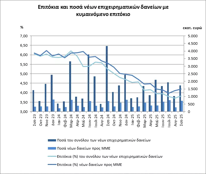 Το μέσο σταθμισμένο επιτόκιο του συνόλου των νέων δανείων προς νοικοκυριά και επιχειρήσεις αυξήθηκε κατά 6 μονάδες βάσης και διαμορφώθηκε στο 4,51%.