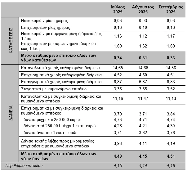 Τον Σεπτέμβριο του 2025, το μέσο σταθμισμένο επιτόκιο του συνόλου των νέων καταθέσεων παρέμεινε σχεδόν αμετάβλητο, σε σχέση με τον προηγούμενο μήνα, και διαμορφώθηκε στο 0,33%.
