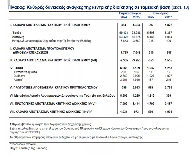 Αναλυτικά, το ταμειακό αποτέλεσμα της κεντρικής διοίκησης τον Ιανουάριο 2026, το ταμειακό αποτέλεσμα της κεντρικής διοίκησης παρουσίασε πλεόνασμα 1.904 εκατ. ευρώ, έναντι πλεονάσματος 560 εκατ. ευρώ τον αντίστοιχο μήνα του 2025.