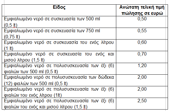 Συγκεκριμένα, για τις επιχειρήσεις κάθε είδους που διακινούν εμφιαλωμένο νερό καθορίζεται η εξής ανώτατη τελική τιμή: