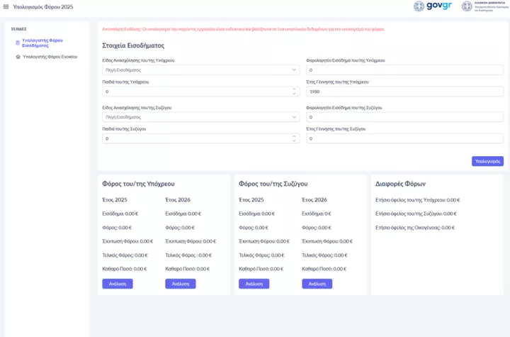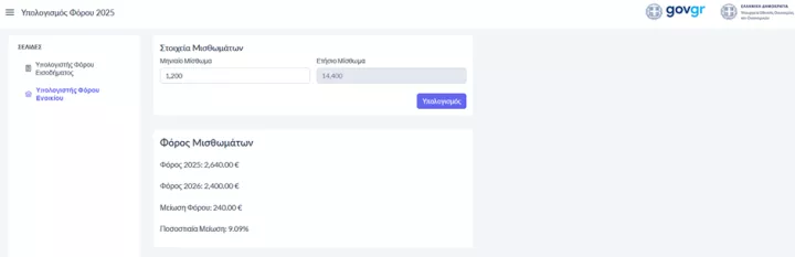 Κάθε πολίτης μπορεί να επιλέξει τον Υπολογιστή Φόρου Εισοδήματος που εμφανίζεται στην αρχική οθόνη ή τον Υπολογιστή Φόρου Ενοικίου.