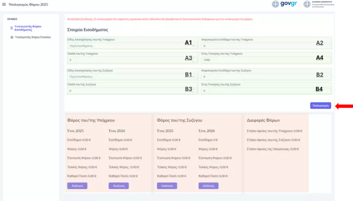 Στην συνέχεια ο/η υπόχρεος πρέπει να πατήσει το κουμπί Υπολογισμός και η εφαρμογή θα υπολογίσει αυτόματα τις μειώσεις.