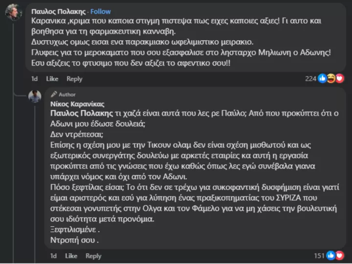 Ο Νίκος Καρανίκας υπερασπίστηκε τον υπουργό Υγείας, υποστηρίζοντας πως τη βία την ασκούν «συνδικαλιστές τραμπούκοι που δεν έχουν επιχειρήματα». Αυτό προκάλεσε την αντίδραση του Παύλου Πολάκη, ο οποίος σχολίασε κάτω από την ανάρτηση του Καρανίκα χαρακτηρίζοντάς τον «παρακμιακό ωφελιμιστικό μειράκιο» και κατηγορώντας τον ότι «γλείφει» τον Άδωνι Γεωργιάδη επειδή καταδίκασε τη βία και επιτέθηκε σε αυτό που περιέγραψε ως «αριστερούς τραμπούκους». Παράλληλα, άφησε αιχμές για την επαγγελματική δραστηριότητα του Καρανίκα στον χώρο της φαρμακευτικής κάνναβης.
