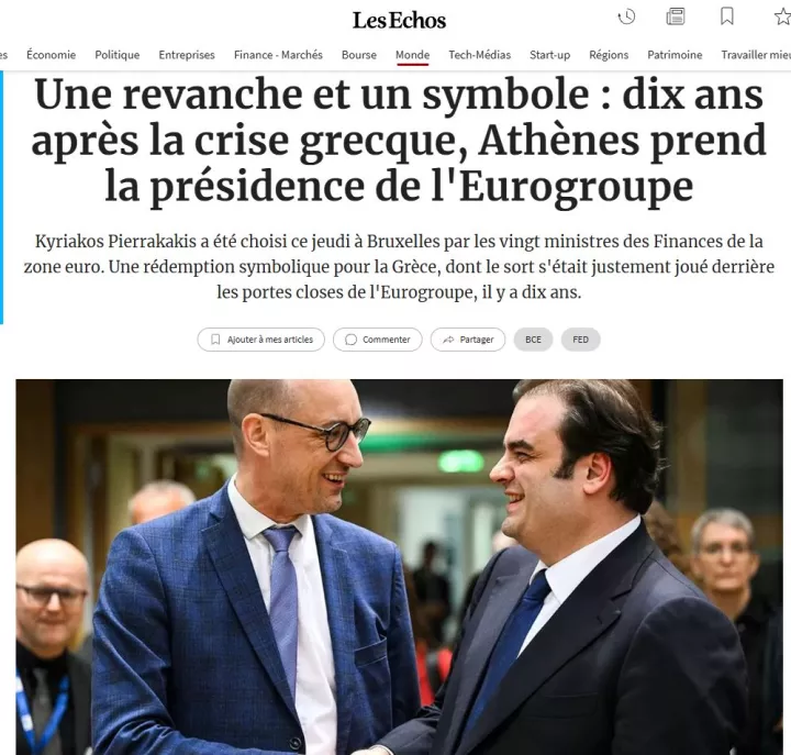 Παράλληλα, η Les Echos γράφει πώς πρόκειται για μια «συμβολική νίκη», σημειώνοντας πως «δέκα χρόνια μετά την ελληνική κρίση, η Αθήνα αναλαμβάνει την προεδρία της Ευρωομάδας».