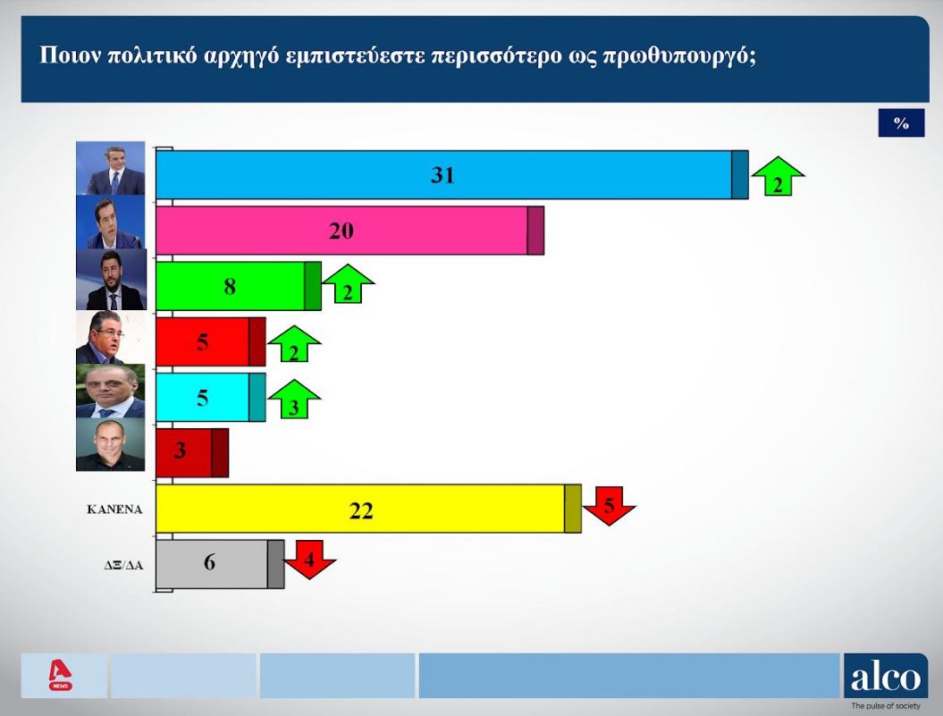 Σύμφωνα με το δεύτερο μέρος της δημοσκόπησης της Alco για τον Alpha ο Κυριάκος Μητσοτάκης συγκεντρώνει 31% έναντι 22% του Αλέξη Τσίπρα. Μάλιστα, η εμπιστοσύνη των πολιτών προς το πρόσωπό του ενισχύθηκε κατά 2 μονάδες σε σχέση με την προηγούμενη μέτρηση.