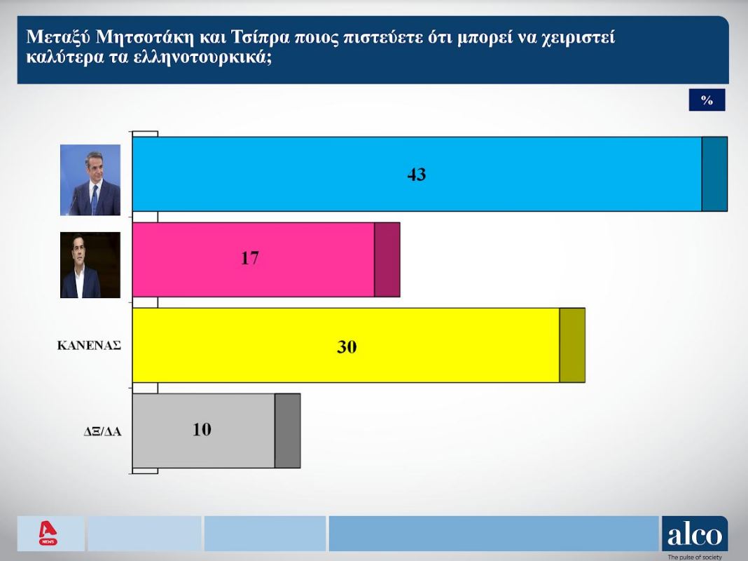Στα ελληνοτουρκικά ο Κυριάκος Μητσοτάκης εμφανίζεται συντριπτικά καλύτερος κατά τους πολίτες. Συγκεντρώνει 43% έναντι 17% του Αλ. Τσίπρα.